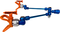 Удлинитель двойной предназначен для увеличения площади окрашиваемой поверхности за один проход. Увеличение окрашиваемой площади достигается за счет подключения двух сопел к одному пистолету. Таким образом, за один проход может быть окрашена площадь сопоставимая площади окраски двумя соплами одновременно.